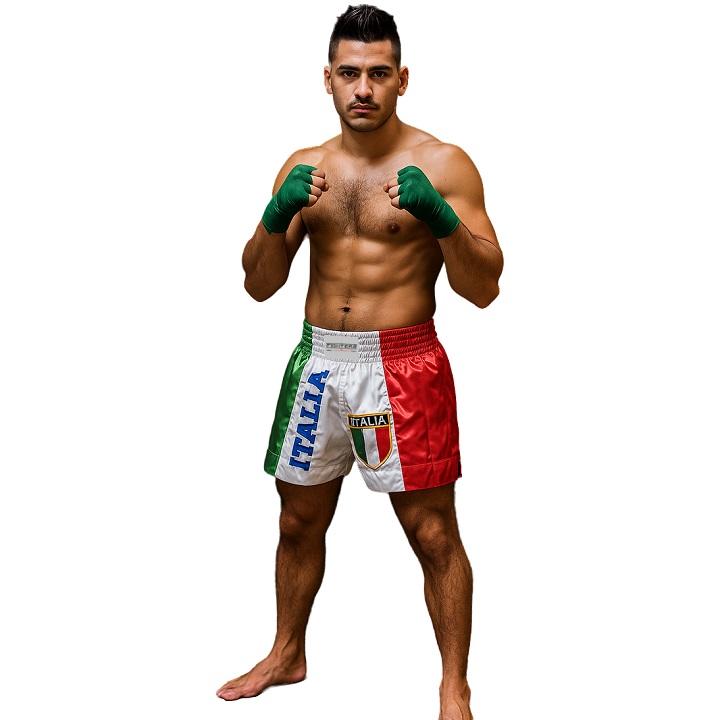 Kick-/Thaiboxing Shorts aus qualitativ hochwertigem edlem Satin. Hervorragende Verarbeitung (hand made). Grün - Weiss - Rot gestreifte Hose mit Italien Wappen und ITALIA Schriftzug. Mit breitem elastischen Bund und seitlichen Schlitzen für perfekten Tragekomfort. Schnürung in der Innenseite. Spezieller Schnitt für High-Kicks und Kniestösse.