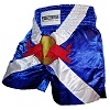Kick-/Thaiboxing Shorts aus qualitativ hochwertigem edlem Satin. Hervorragende Verarbeitung (hand made). Weisse Hose mit Bulls Symbol auf der Vorderseite und blaue Streifen.Mit breitem elastischen Bund und seitlichen Schlitzen für perfekten Tragekomfort. Schnürung in der Innenseite. Spezieller Schnitt für High-Kicks und Kniestösse.